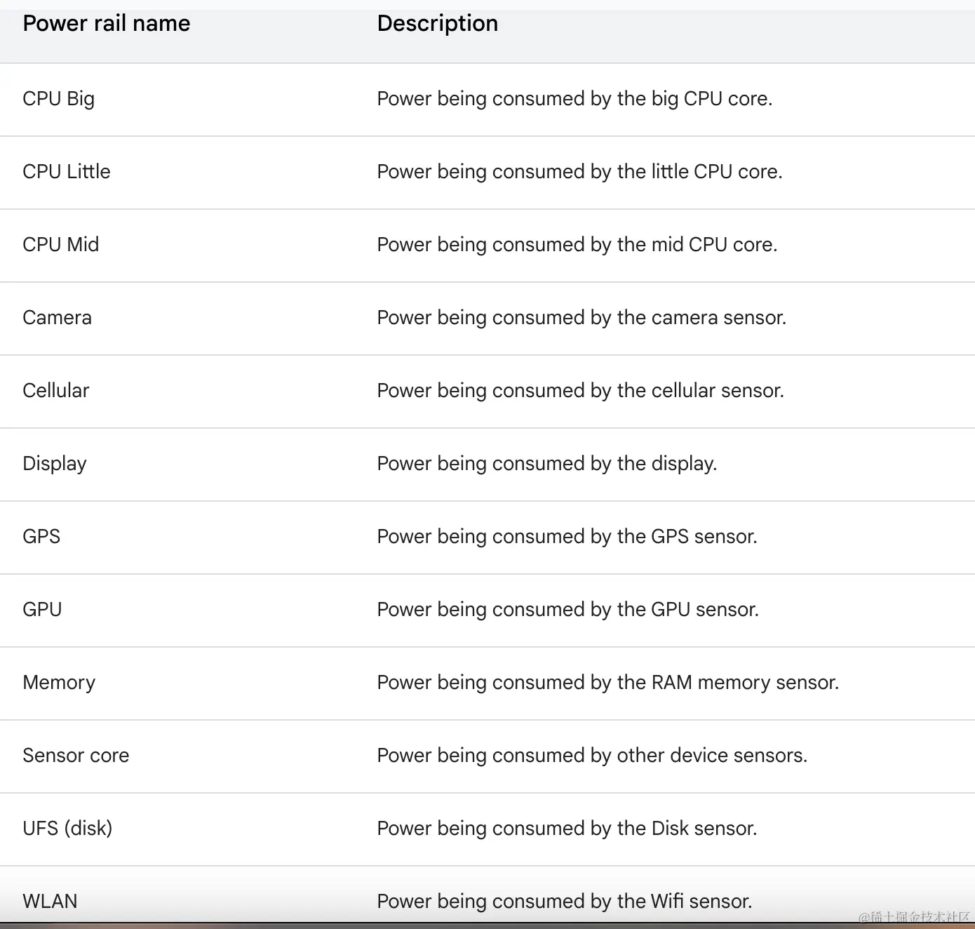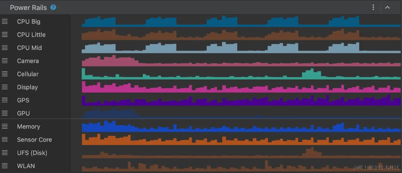 ODPM 报告所有可分析的 Power Rails,需要 Android 10(API 级别 29)及更高版本以及 Pixel 6 和后续 Pixel 设备,详细可见:developer.android.com/studio/prof…