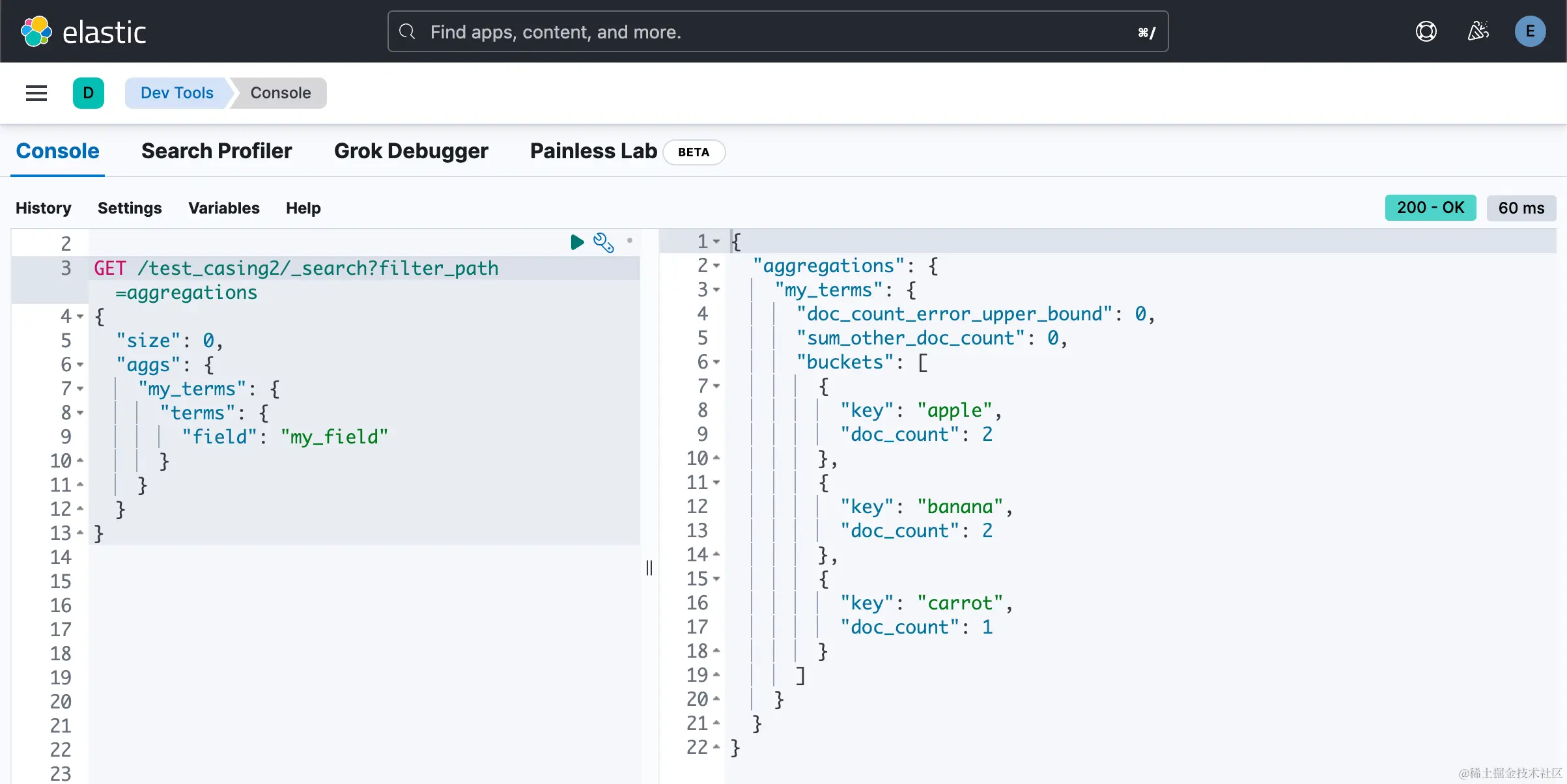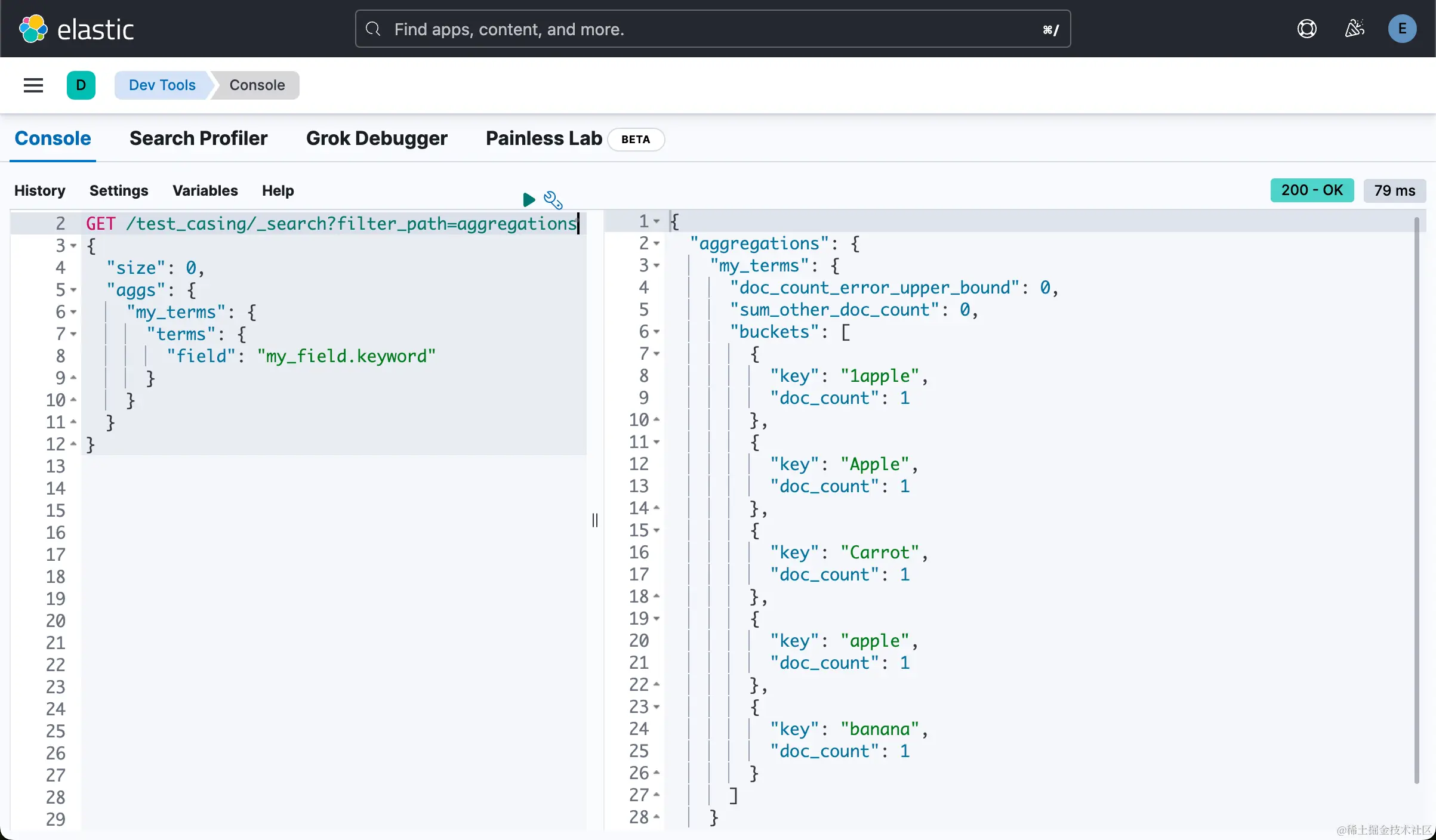 需要注意的是,使用标准化器会改变索引中的值。 如果你想保留原始值,例如带有大写 “A” 的 “Apple”,你可以使用子字段(sub-fields)。 这允许你保留原始字段值和标准化字段值。 在聚合结果中,Elasticsearch 将仅显示你在聚合中使用的字段。
