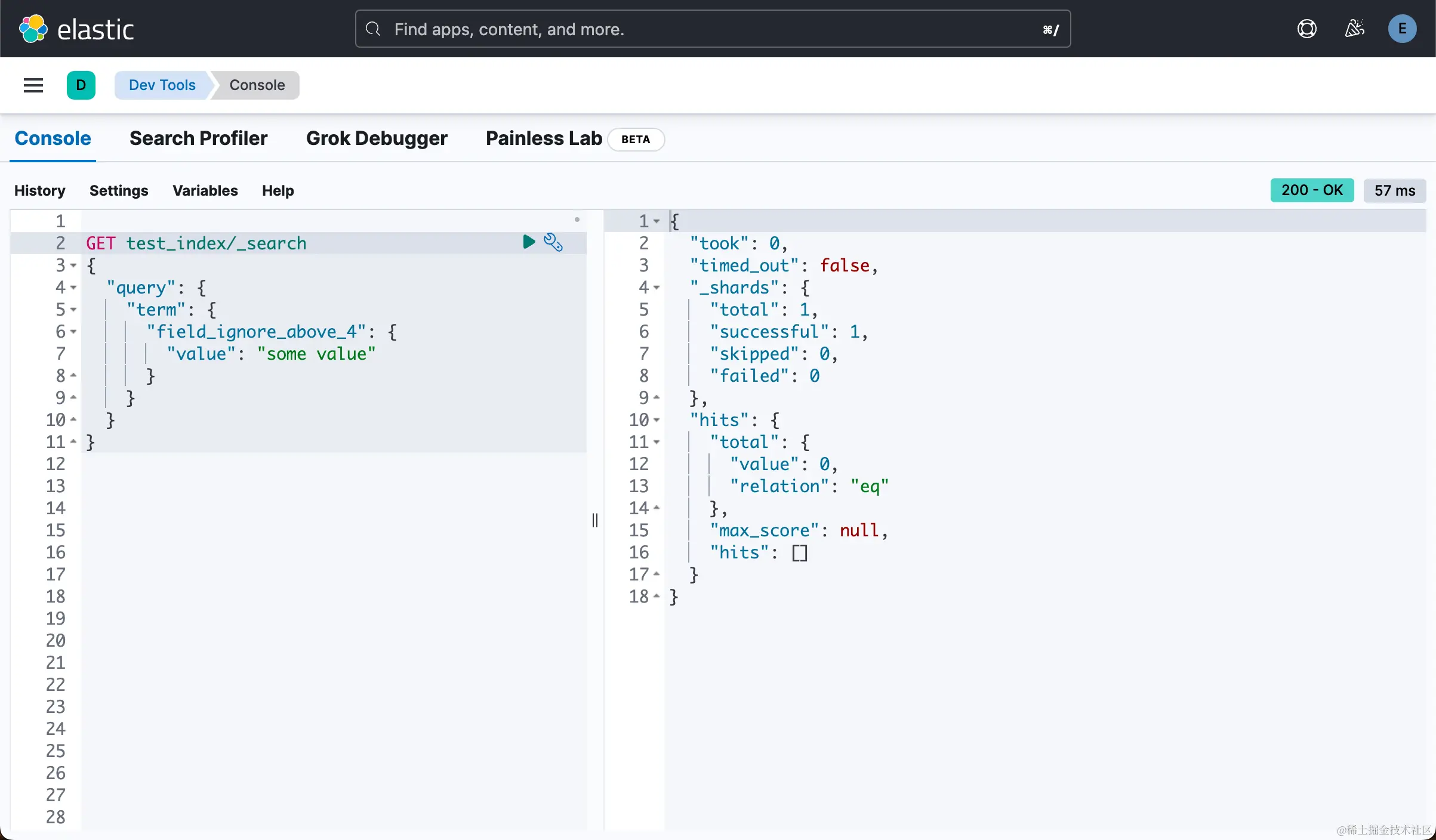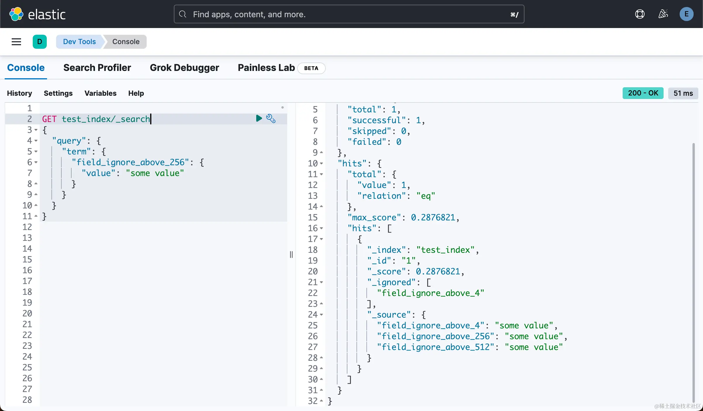 当我们对 “test_index” 执行搜索时,我们可以看到 “field_ignore_above_4” 被忽略,因为它的值超出了 “ignore_above” 限制: