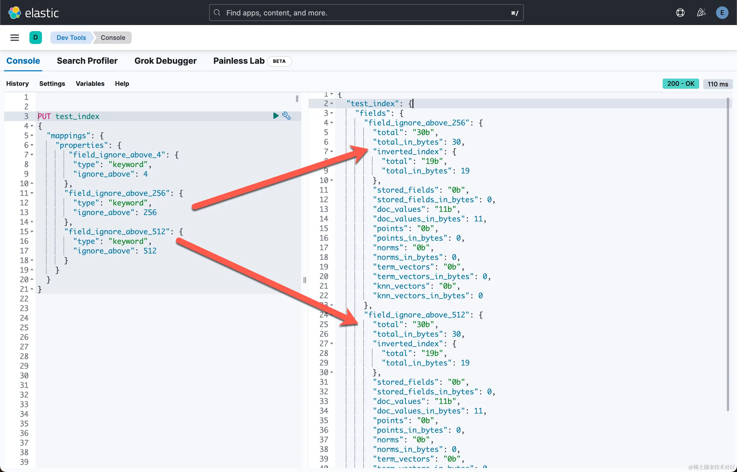 从响应中,我们可以看到 field_ignore_above_256 和 field_ignore_above_512 的总大小相同,均为 30 字节。