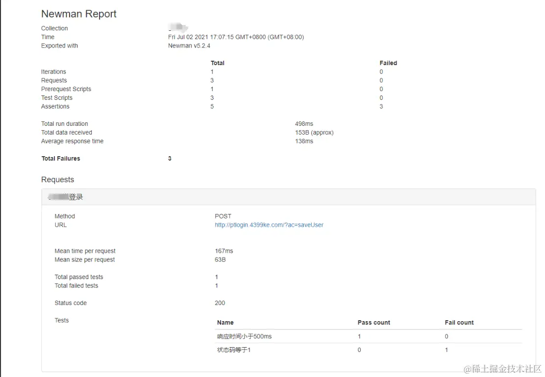 用newman命令行运行测试集语句为:newman run 集合名/url地址 -n 次数 即为:newman run C:\Users\PC\Desktop\xxx.postman_collection.json -d C:\Users\PC\Desktop\登录.csv -n 4 --delay-request 200