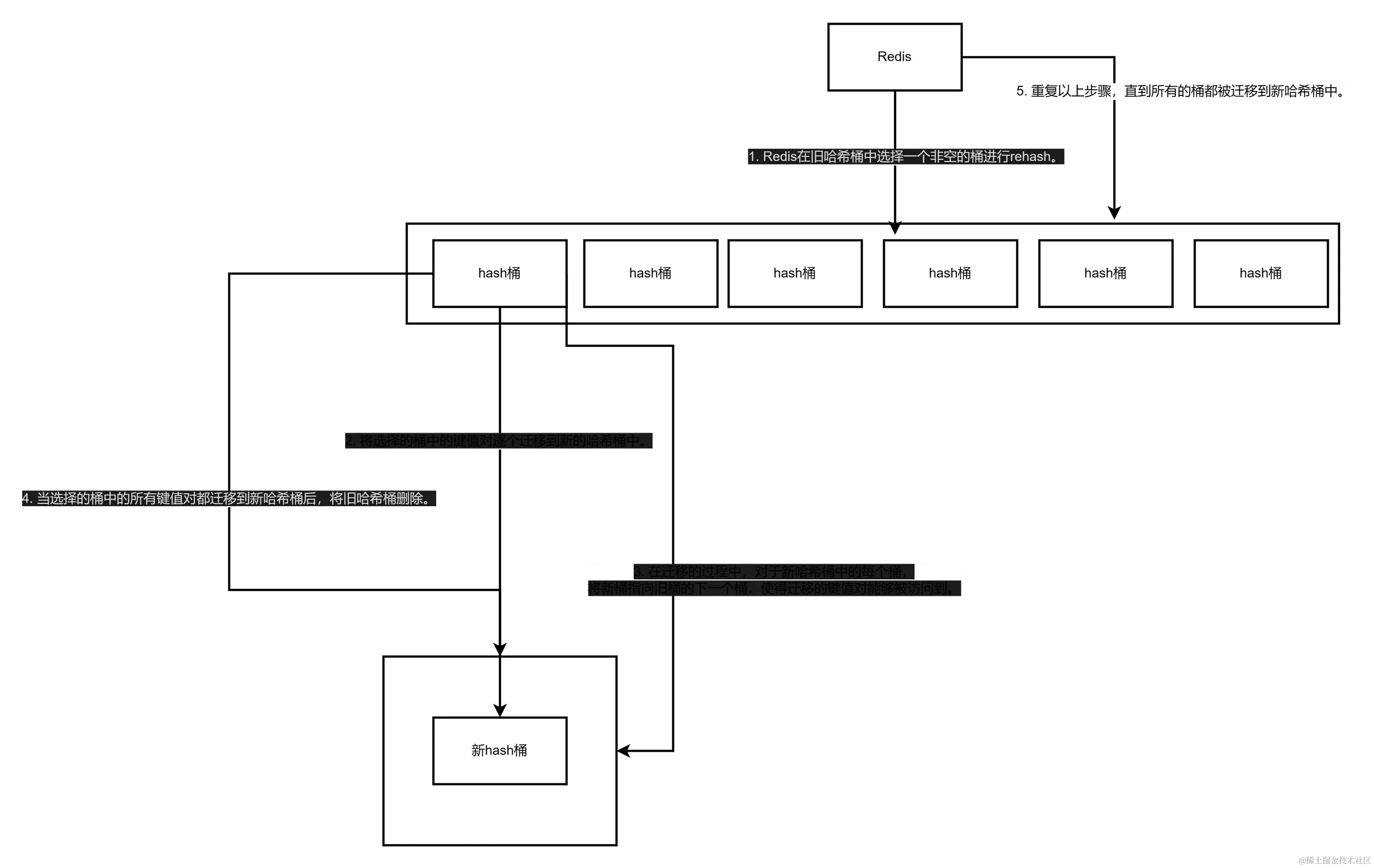 当选择的桶中的所有键值对都迁移到新哈希桶后,将旧哈希桶删除。