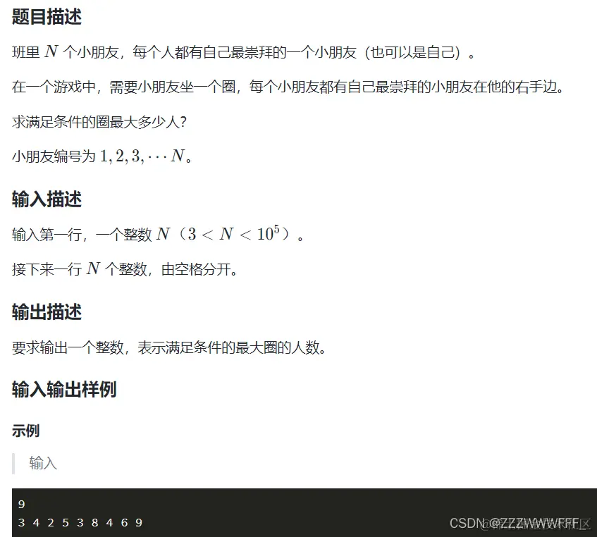 该思路:我们发现我们得到的数据肯定都至少会形成一个“崇拜圈”,而且必然会有“从哪里来回哪里去”的情况,那么不妨我们就一个一个试,遍历每一个孩子作为崇拜圈的起点,如果可以回到起点,我们就记录下来并且在后面找到新的崇拜圈的时候更新最大值(记得每次dfs之前需要将visited重新初始化)