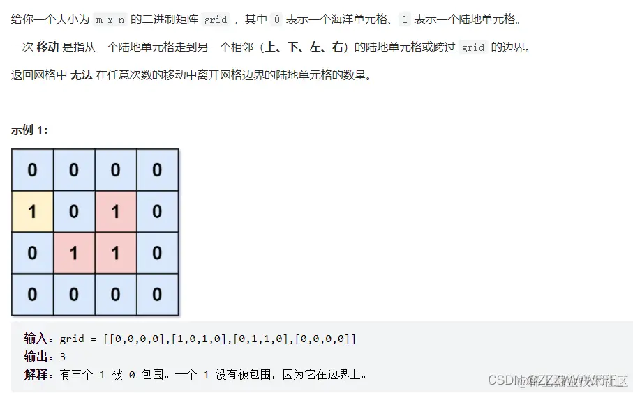 思路上我们只需遍历边缘上的1(即只要在边缘上遇到1,我们就搜索所有与它相连的1),并且将它们都变成0,最后遍历整个数组,如果还没有变成1的就是飞地