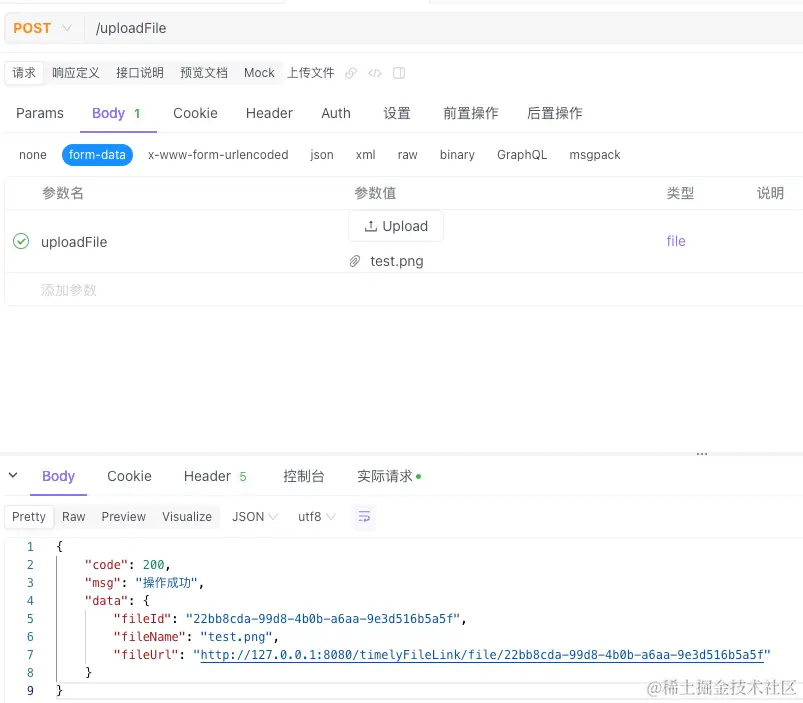 其中返回的文件链接为:<http://127.0.0.1:8080/timelyFileLink/file/22bb8cda-99d8-4b0b-a6aa-9e3d516b5a5f>