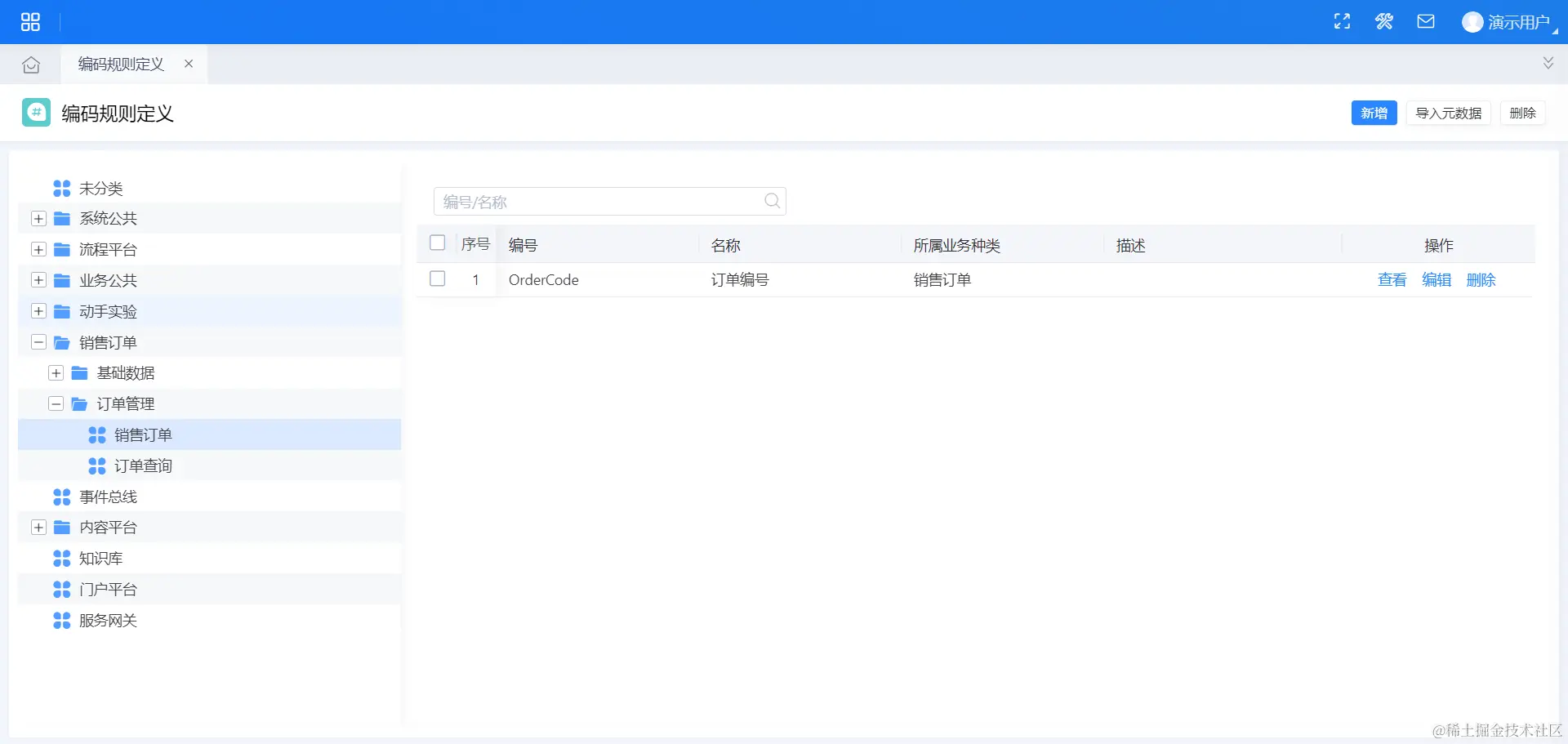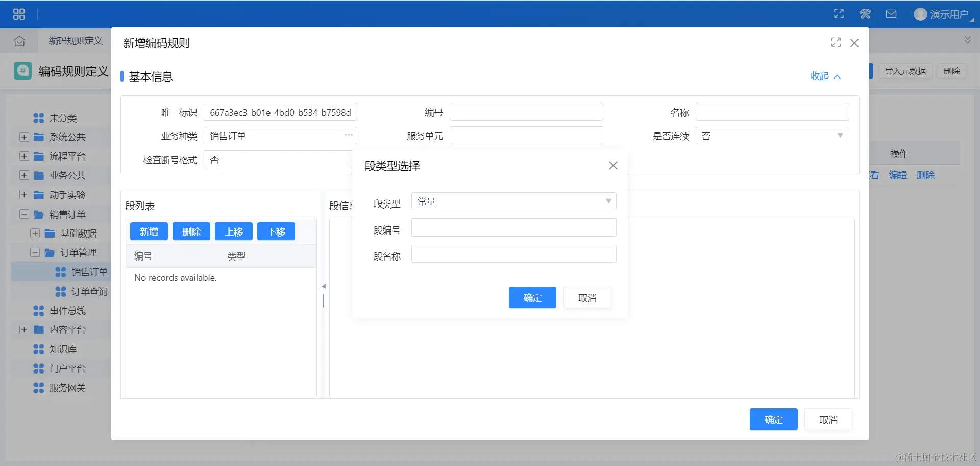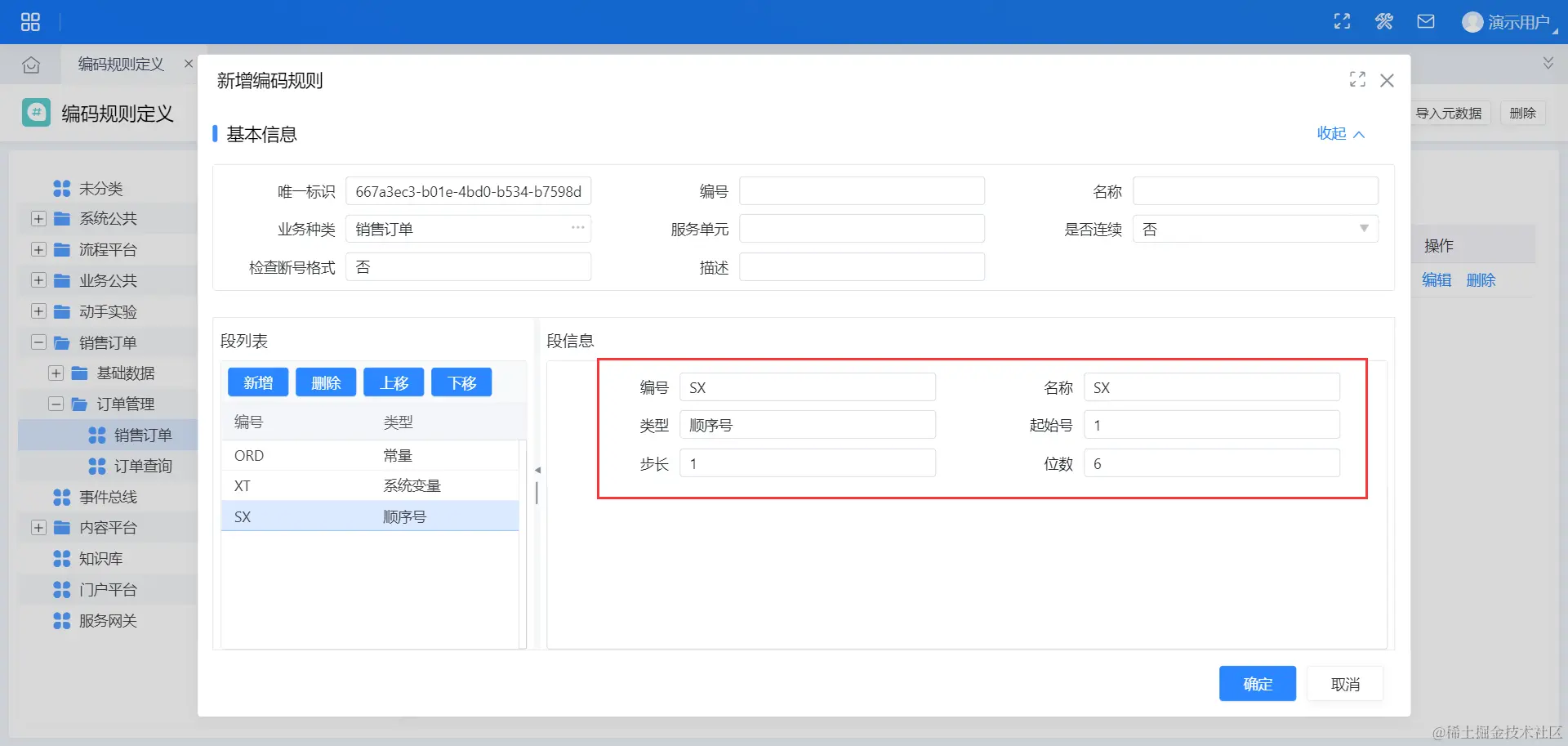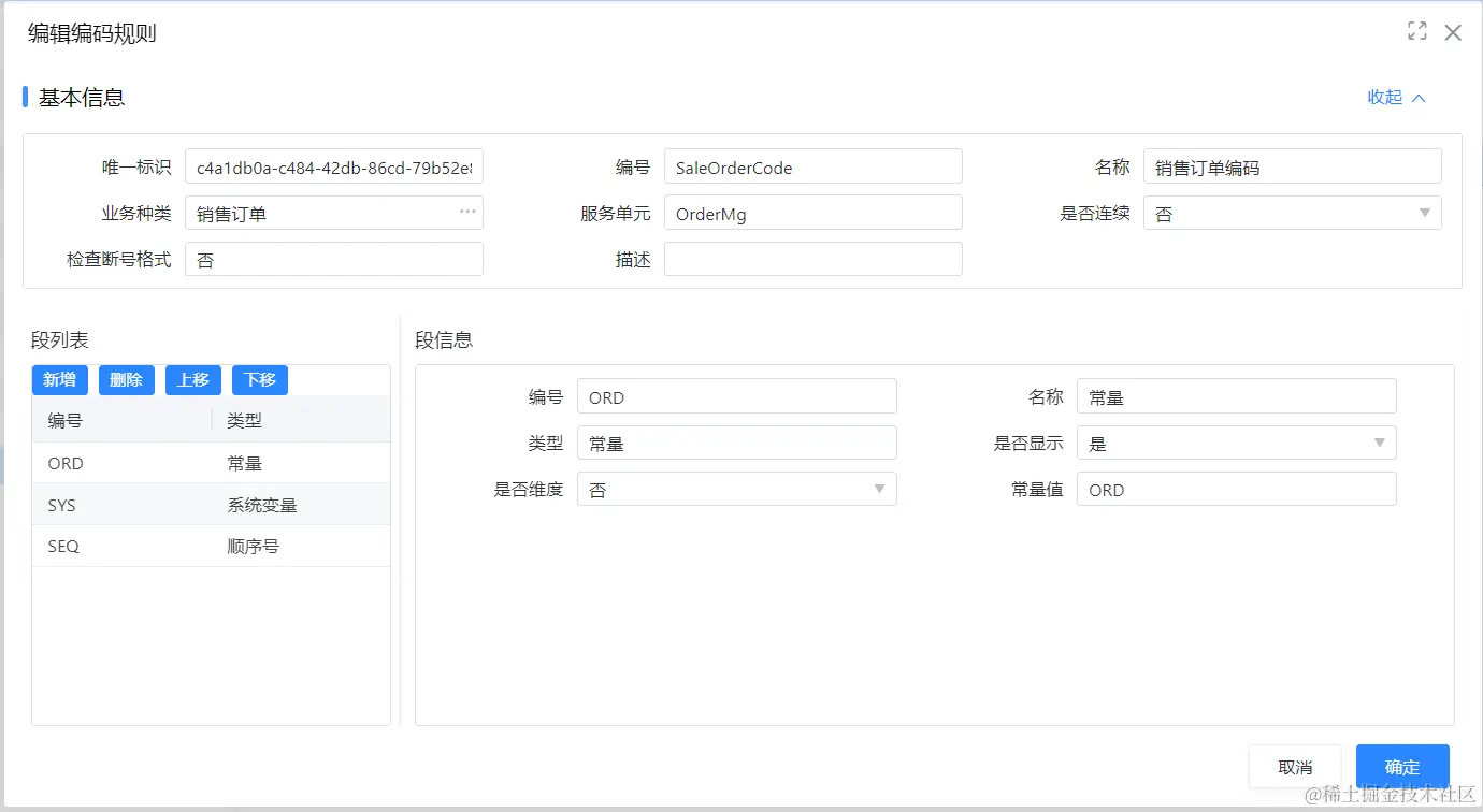编码规则定义规定了编号的生成格式,一条编码规则定义由基本信息和段列表组成:基本信息是对该编码规则的概述,包含编号、名称、所属业务种类、是否连续等;段列表规定了生成后的编码由几部分组成、各个部分的的生成方式,目前编码规则支持的段类型包括常量段、系统变量段、外部参数段、顺序号段。