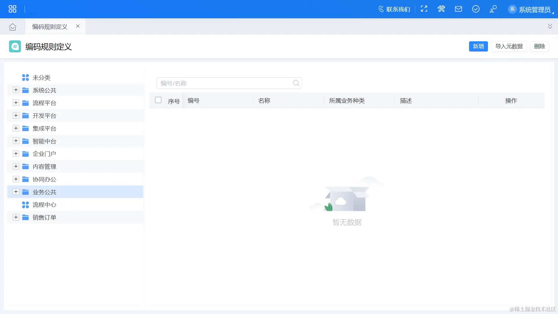 打开编码规则定义功能后,在导航栏下选择自己所建的应用,点击界面右上方【新增】按钮打开新建编码规则页面。