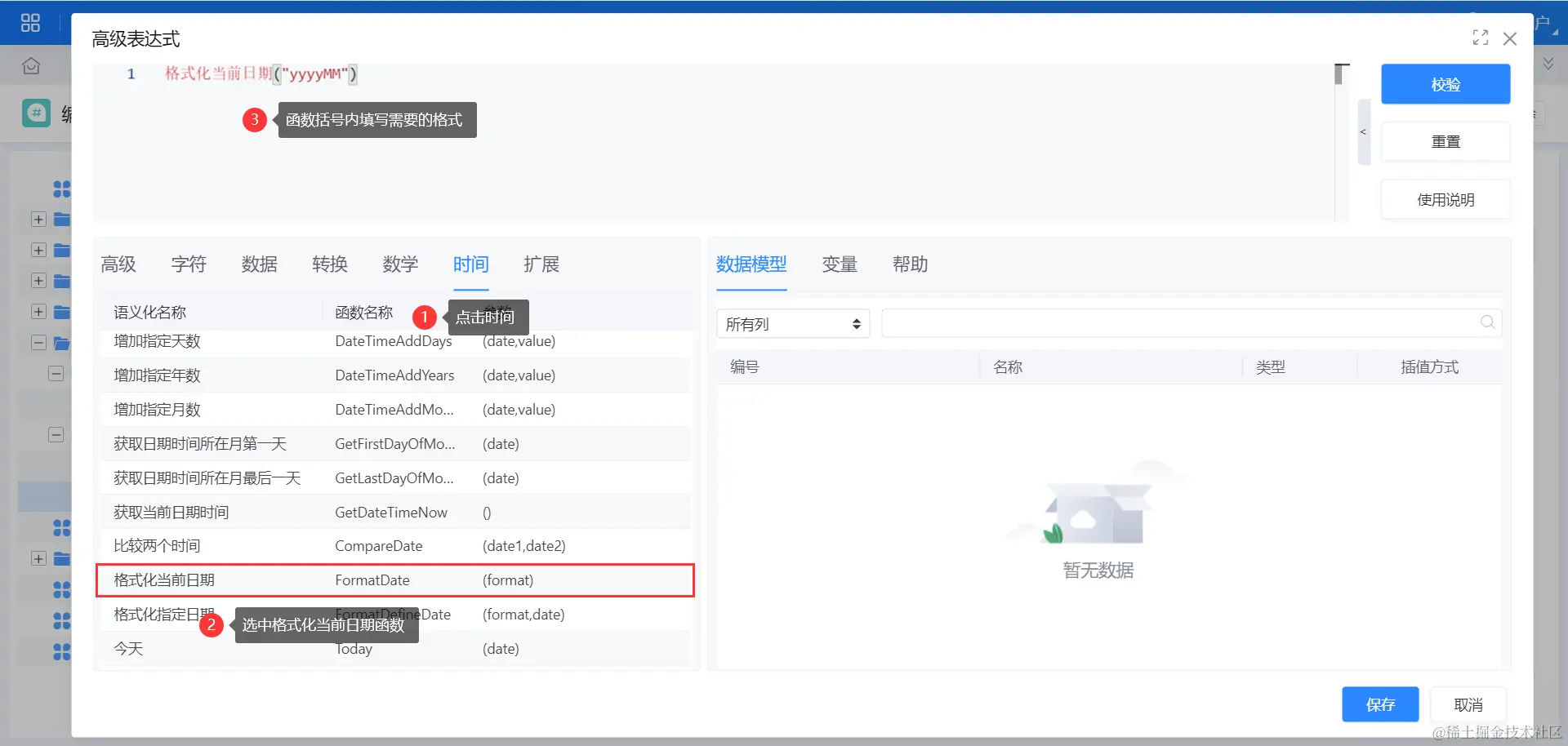 在“表达式”中,需要选择获取系统当前日期的函数,日期格式设置为:yyyyMM。