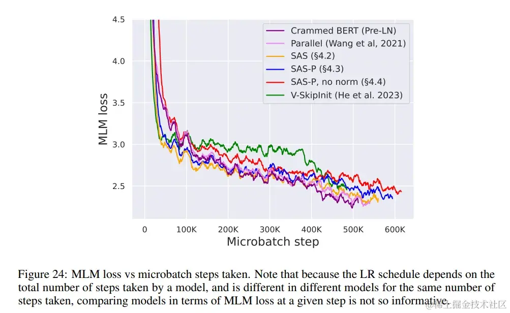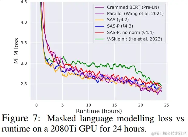 如图 7 所示,在 24 小时运行时内,与(Crammed)Pre-LN 基线相比,本研究的简化块可以媲美掩蔽语言建模任务的预训练速度。另一方面,在不修改值和投影的情况下删除残差连接再次导致训练速度的显著下降。在图 24 中,作者提供了 microbatch 步骤的等效图。