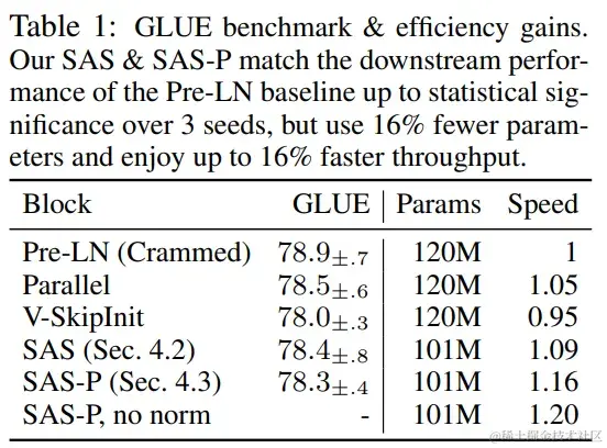 在表 1 中,研究者还详细列出了使用不同 Transformer 块的模型在掩蔽语言建模任务中的参数数量和训练速度。他们以预训练 24 小时内所采取的 microbatch 步骤数与基线 Pre-LN Crammed BERT 的比率计算了速度。结论是,模型使用的参数减少了 16%,SAS-P 和 SAS 的每次迭代速度分别比 Pre-LN 块快 16% 和 9%。
