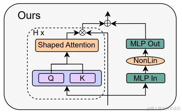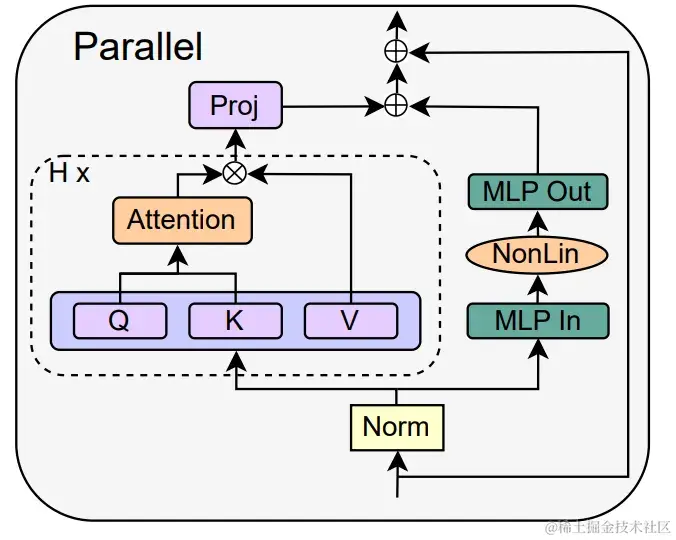 作者转向并行 MHA 和 MLP 子块的概念,这在几个近期的大型 transformer 模型中已被证明很受欢迎,例如 PALM 和 ViT-22B。并行 transformer 块如下图所示。