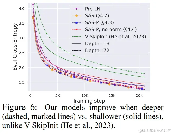 从图 6 中可以观察到,将深度从 18 个块扩展到 72 个块后,本研究的模型和 Pre-LN transformer 的性能都得到了提高,这表明本研究中的简化模型不仅训练速度更快,而且还能利用更大的深度所提供的额外能力。事实上,在使用归一化时,本研究中的简化块和 Pre-LN 的每次更新轨迹在不同深度下几乎没有区别。