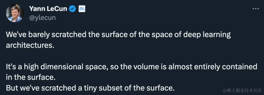 对此,图灵奖得主 Yann LeCun 的评价是:「我们仅仅触及了深度学习架构领域的皮毛。这是一个高维空间,因此体积几乎完全包含在表面中,但我们只触及了表面的一小部分。」