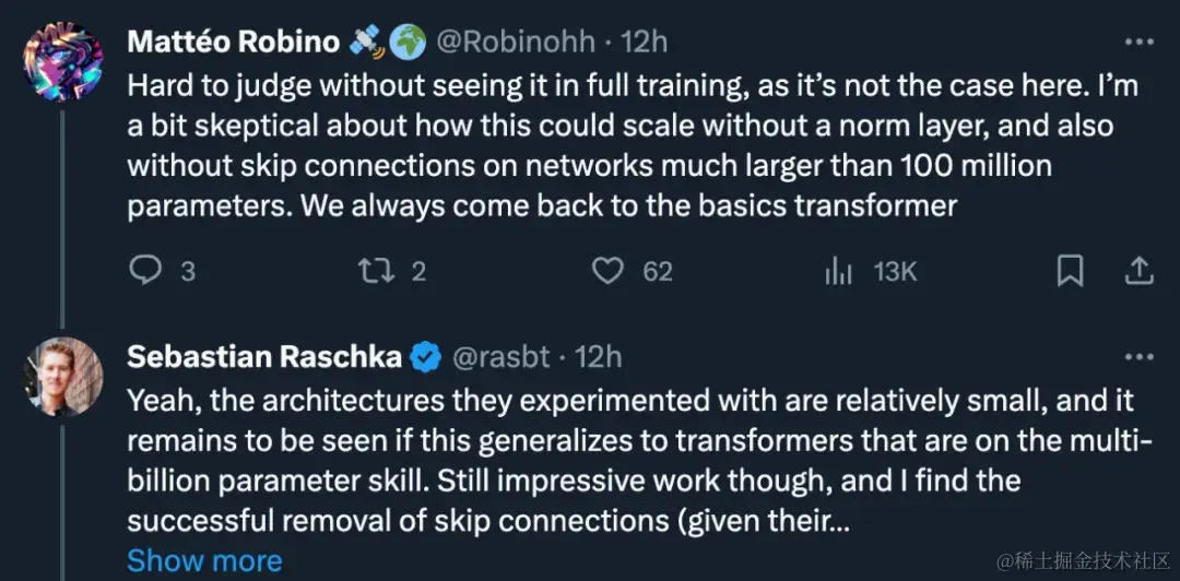 Sebastian Raschka 表示赞同:「是的,他们试验的架构相对较小,这是否能推广到数十亿参数的 Transformer 上还有待观察。」但他仍然表示这项工作令人印象深刻,并认为成功移除残差连接是完全合理的(考虑到其初始化方案)。