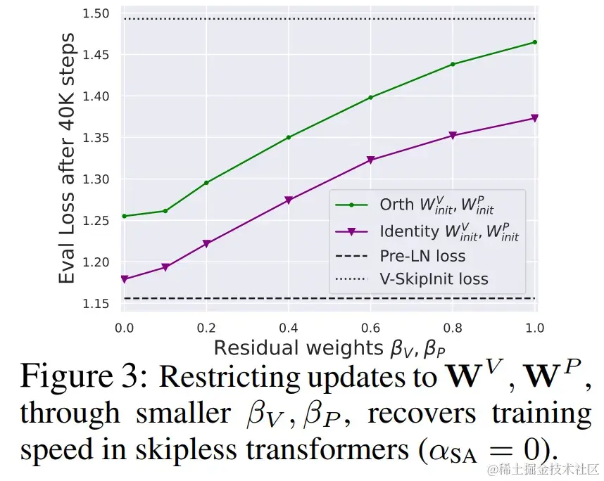 从图 3 中可以得出结论,完全移除值和投影参数 W^V、W^P 是可能的,而且每次更新的训练速度损失最小。也就是说,当 β_V = β_P = 0 和 identity 初始化的