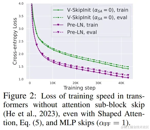 在相同的训练步数后,本研究基本上能达到 Pre-LN 块的性能。在这种情况下,在整个训练过程中都有 W^V = W^P = I,即值和投影参数是一致的。作者在 4.2 节介绍了详细方法。