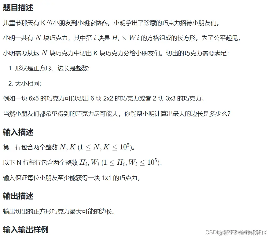 总体来说我们的思路就是,枚举切出的正方形巧克力边长,然后分别用我们所拥有的巧克力的长和宽来除以我们的枚举边长,得到的二者相乘我们就能得到该块巧克力能分出的该种边长的块数了,直到我们找到最大的能分出的巧克力块数即可break了