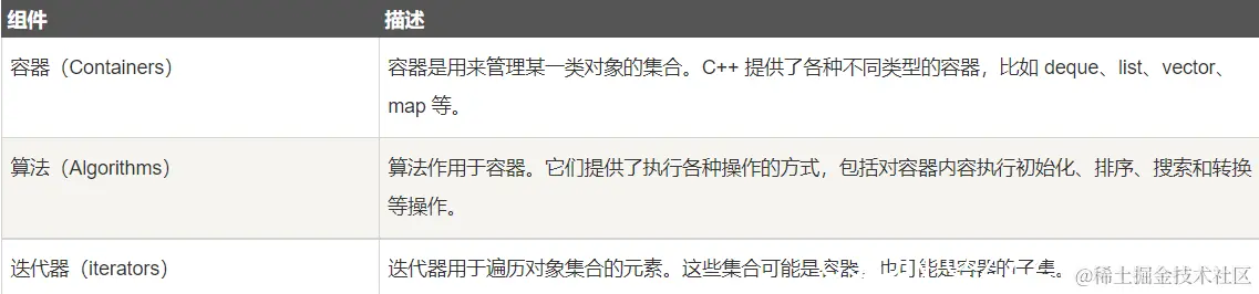 C++ 标准模板库的核心包括以下三个组件:
