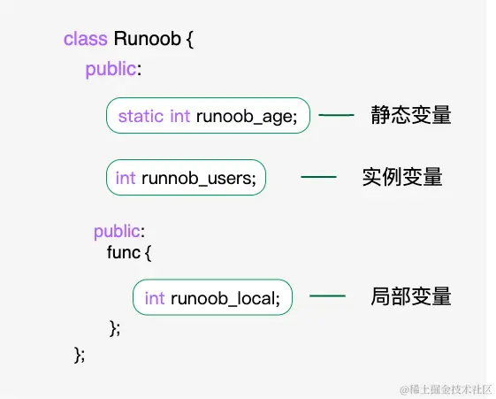 关键字 public 确定了类成员的访问属性。在类对象作用域内,公共成员在类的外部是可访问的。您也可以指定类的成员为 private 或 protected,这个我们稍后会进行讲解。