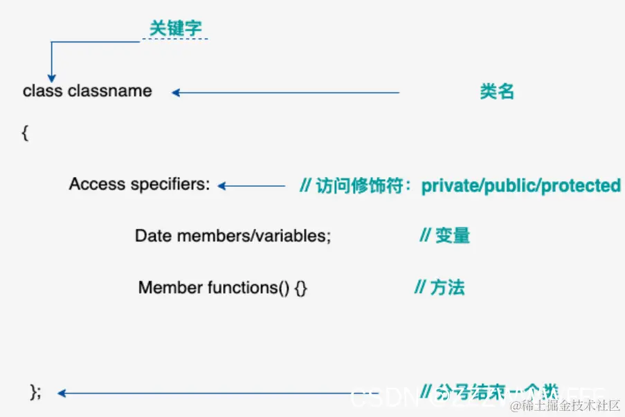 class Base { public: // 公有成员 protected: // 受保护成员 private: // 私有成员 };