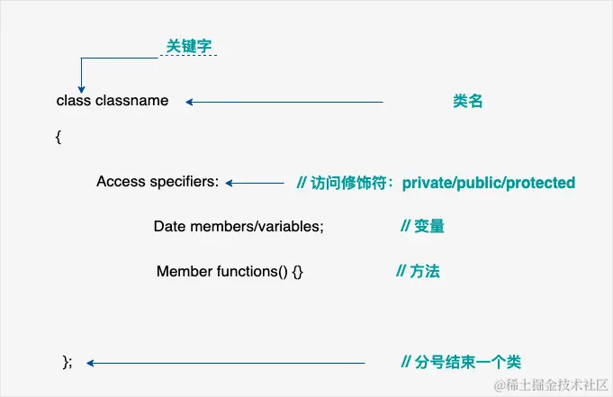 类定义是以关键字 class 开头,后跟类的名称。类的主体是包含在一对花括号中。类定义后必须跟着一个分号或一个声明列表。例如,我们使用关键字 class 定义 Box 数据类型,如下所示: