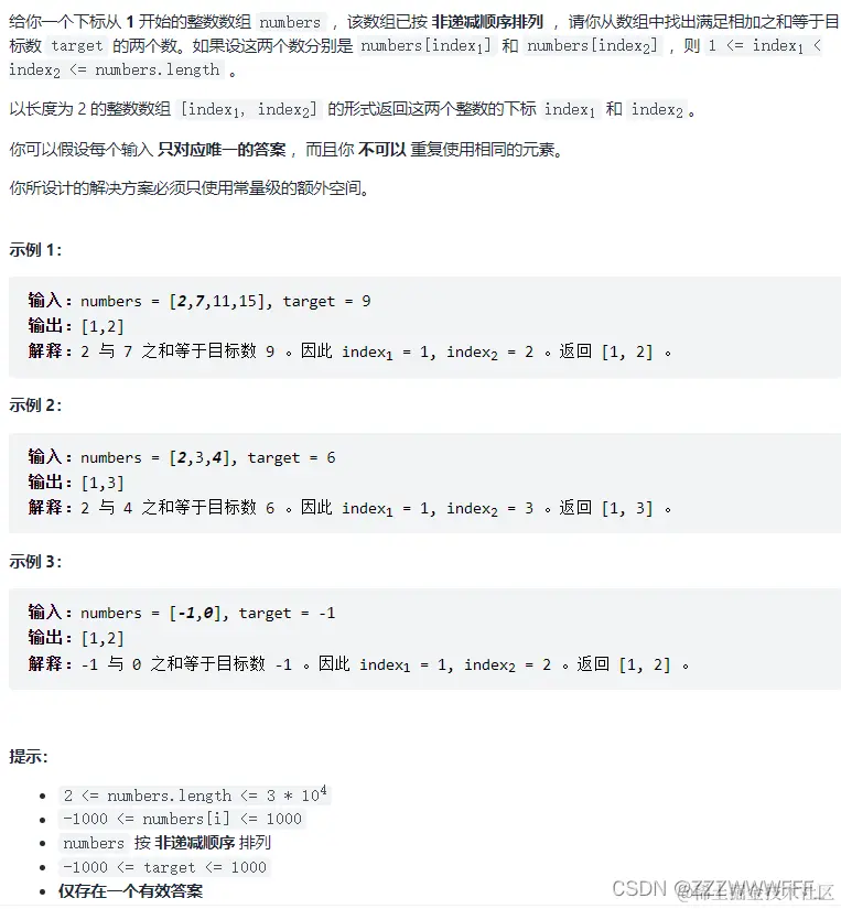 审题上:首先该题可能在题目描述上有些问题,该题所说的“给你一个下标从1开始的整数数组”的意思并不是说真的该数组中的第一个元素在下标为1的内存里,而是说我们在最后返回的时候要把该数组当成是下标从1开始的,即我们的第一个元素下标还是0,只不过返回时下标都要+1