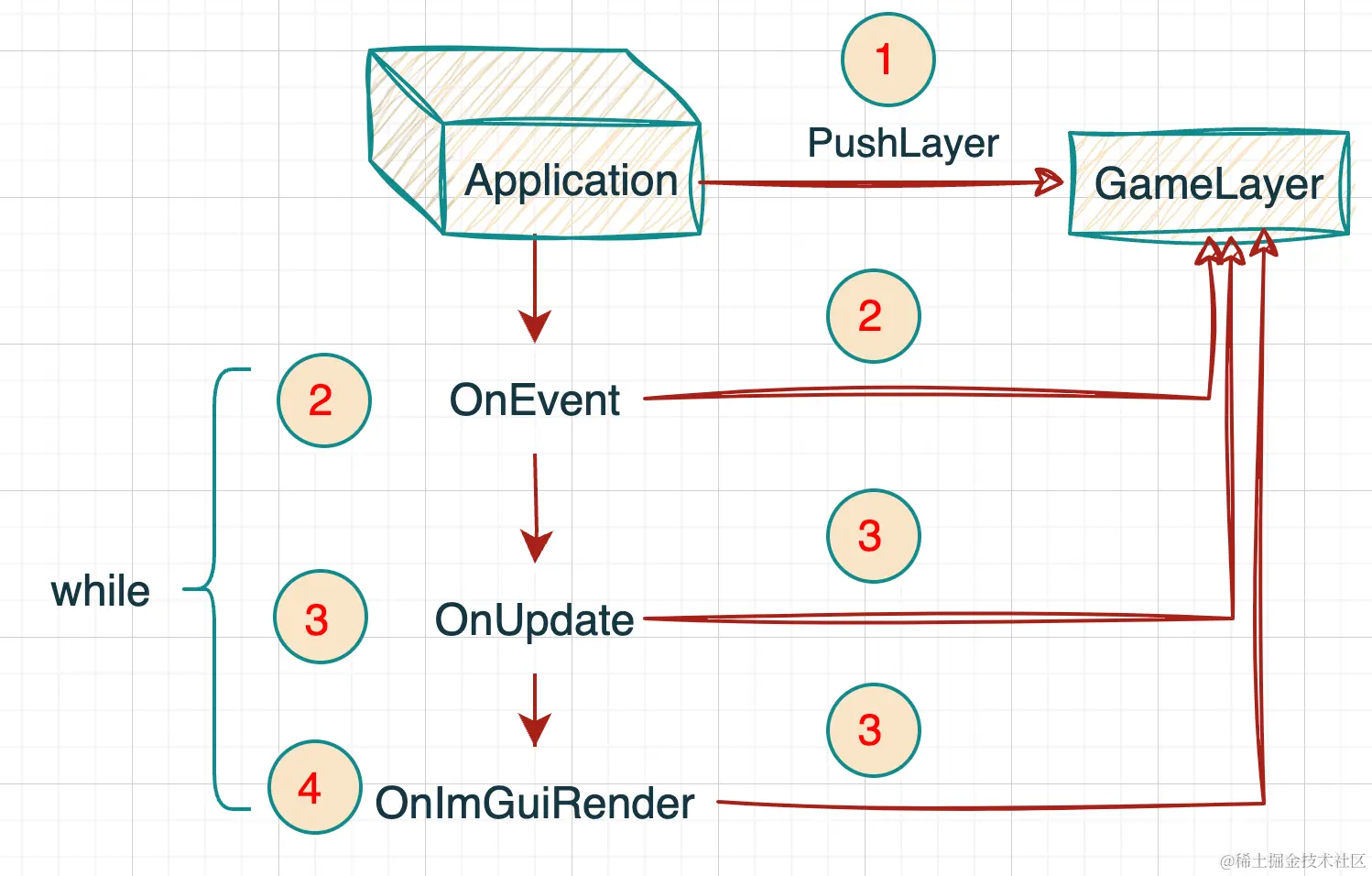 所有的逻辑封装在GameLayer中。游戏启动后,将GameLayer入栈,之后在while循环中,依次执行: