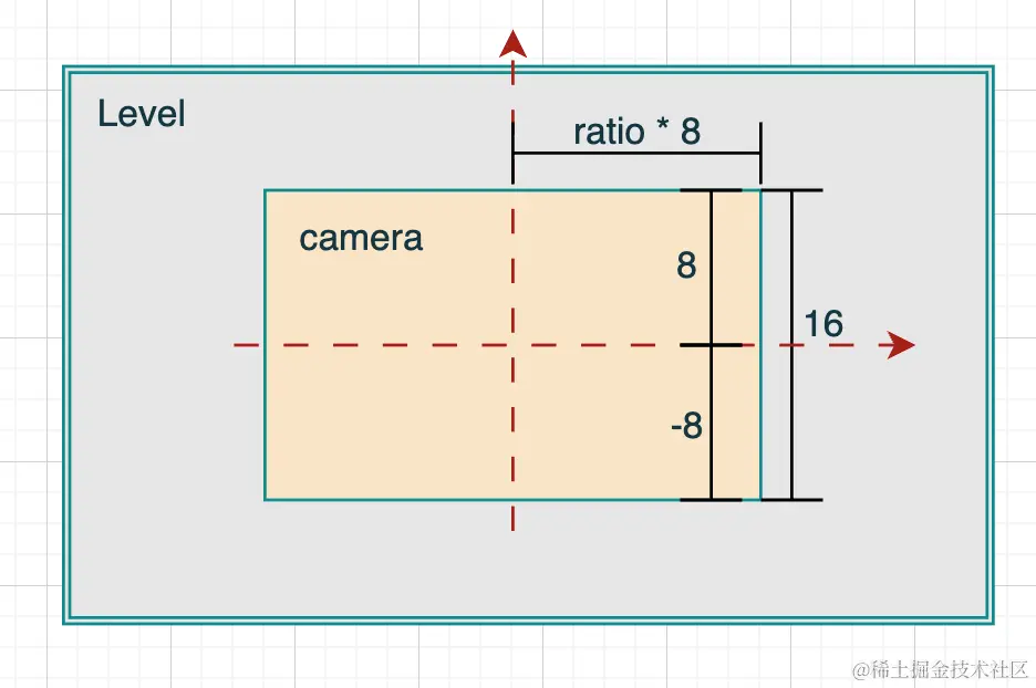 正交Camera上下高为16,宽为16 * ratio,即只能看到场景中间camera高 * camera宽的范围。