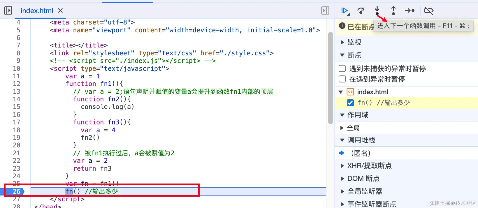 为了更直观的查看,可以在浏览器中运行代码,并通过控制断点进而控制代码的执行,查看代码块作用域的变化。具体操作可以通过代码断点,与控制【进入下一个函数调用】按钮控制代码的运行