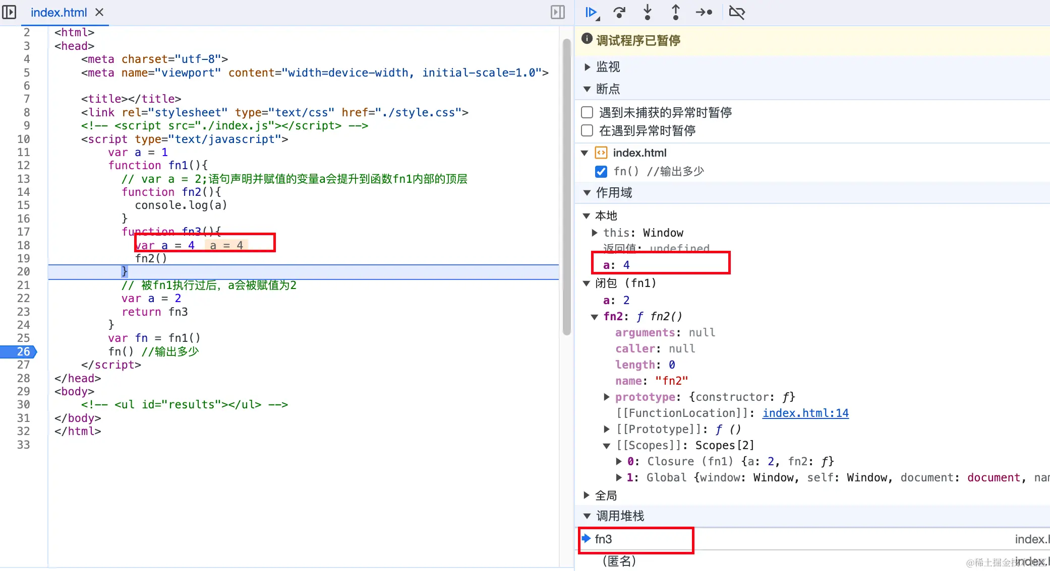 var a = 4 // 该语句放置在fn2()前面,则打印的结果值是4