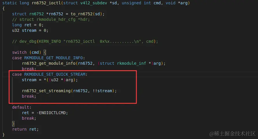 注意: 在 VICAP 模块中产生复位后,是不能解决分屏的问题,它的主要目的是监测图像是否错误,并触发复位信号,复位信号产生后,会在驱动程序的控制函数中产生 RKMODULE_SET_QUICK_STREAM 控制信号。然后利用这个复位信号对设备进行复位便可解决分屏的问题,如下图所示: