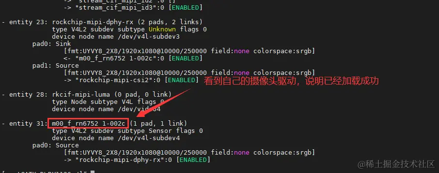 在调试需要先确定摄像头驱动是否已经正常加载,可以使用命令 media-ctl -p -d /dev/mediaX 进行查看,如下图所示: