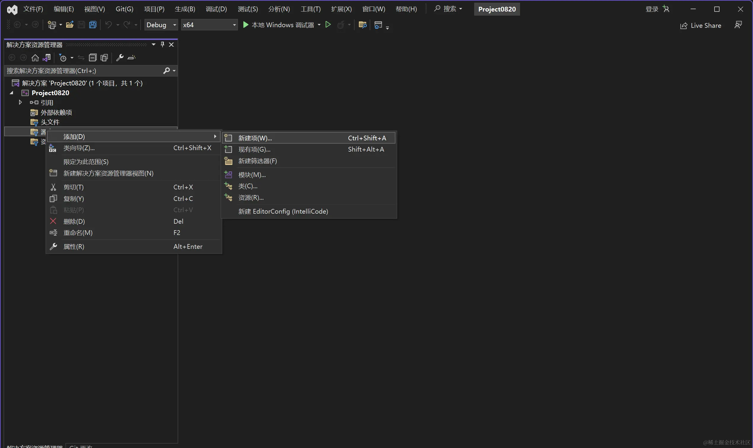 右键源文件,选择添加->新建项,给C++文件起个名称,然后点击添加即可。