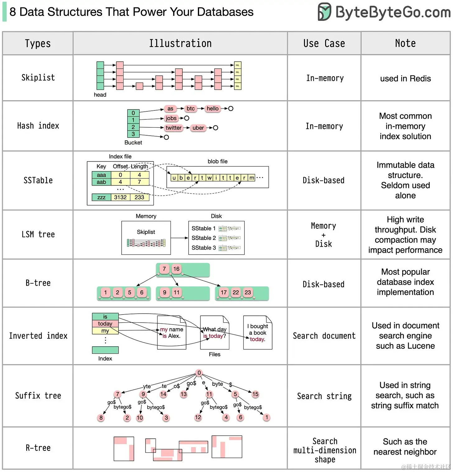 SSTable (Sorted String Table):一种持久化到磁盘的有序键值对集合,常用于NoSQL数据库的数据文件格式。