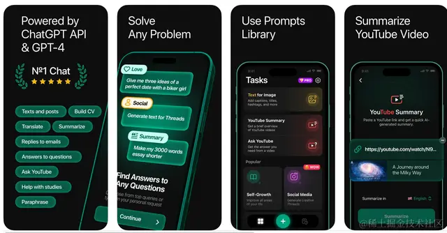 在商店展示页面中,【AI ChatBot】同样强调了自己使用的是最新的GPT-4模型、自己是Chatbot中的NO.1、自己可以解决任何问题,同样具有拍摄扫描、自媒体文案生成、保存对话历史,以及YouTube视频文案总结等实用功能。