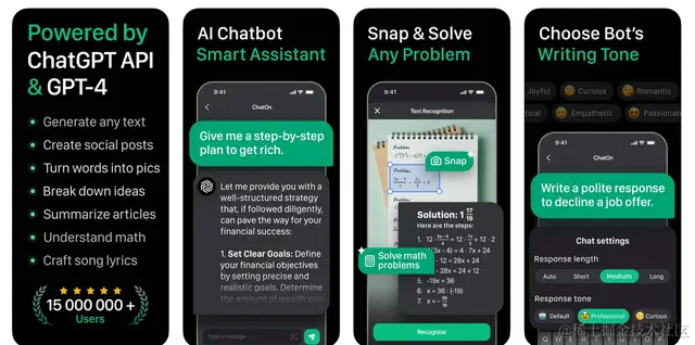 而在商店页面展示图中,【ChatOn】才开始“亮肌肉”。GPT-4模型、1500万用户、智能助手、OCR扫描识别、数学难题解答、对话语气调整、AI图片生成等最新功能则最大程度满足了不同用户的各种需求,真正做到了开箱即用。也有用户因此戏称其为“美国版作业帮”“妈妈再也不用担心我的学习啦”。