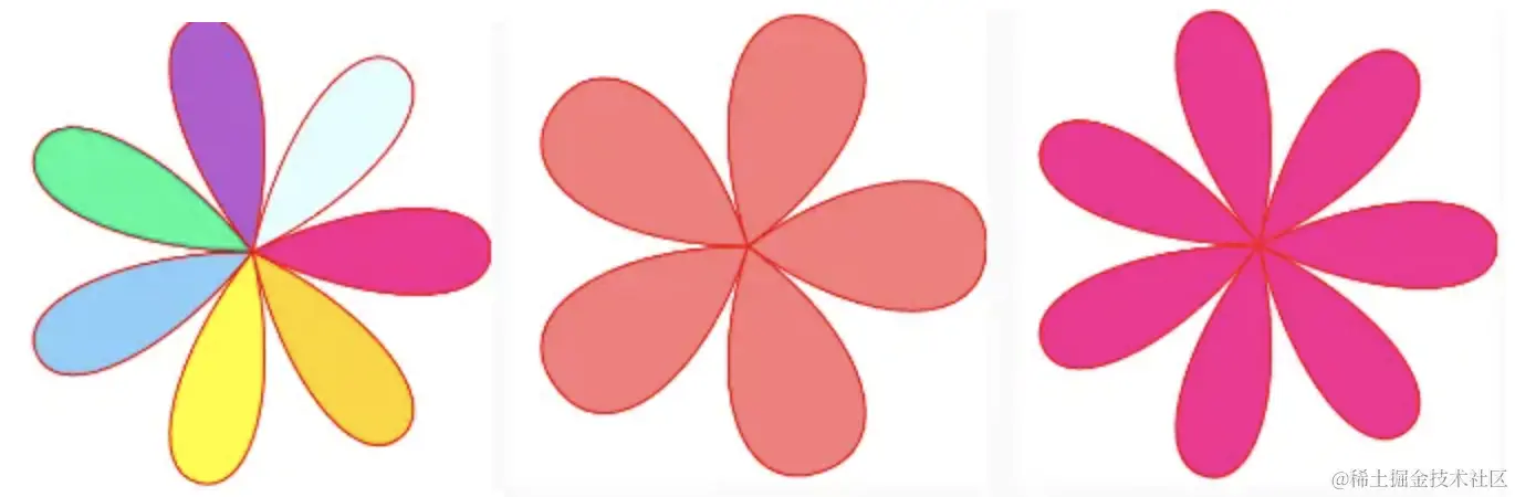 对于花朵而言,首先要构建花瓣,花瓣这里使用了三阶贝赛尔曲线,绘制更加精确,二阶贝赛尔曲线用来画树叶,也是不错的。