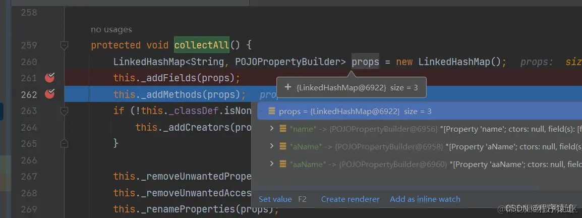 然后进过一系列的操作,我们最终来到了 POJOPropertiesCollector 的 collectAll 这个方法,我们在 _addFields 与 _addMethods 打个断点。