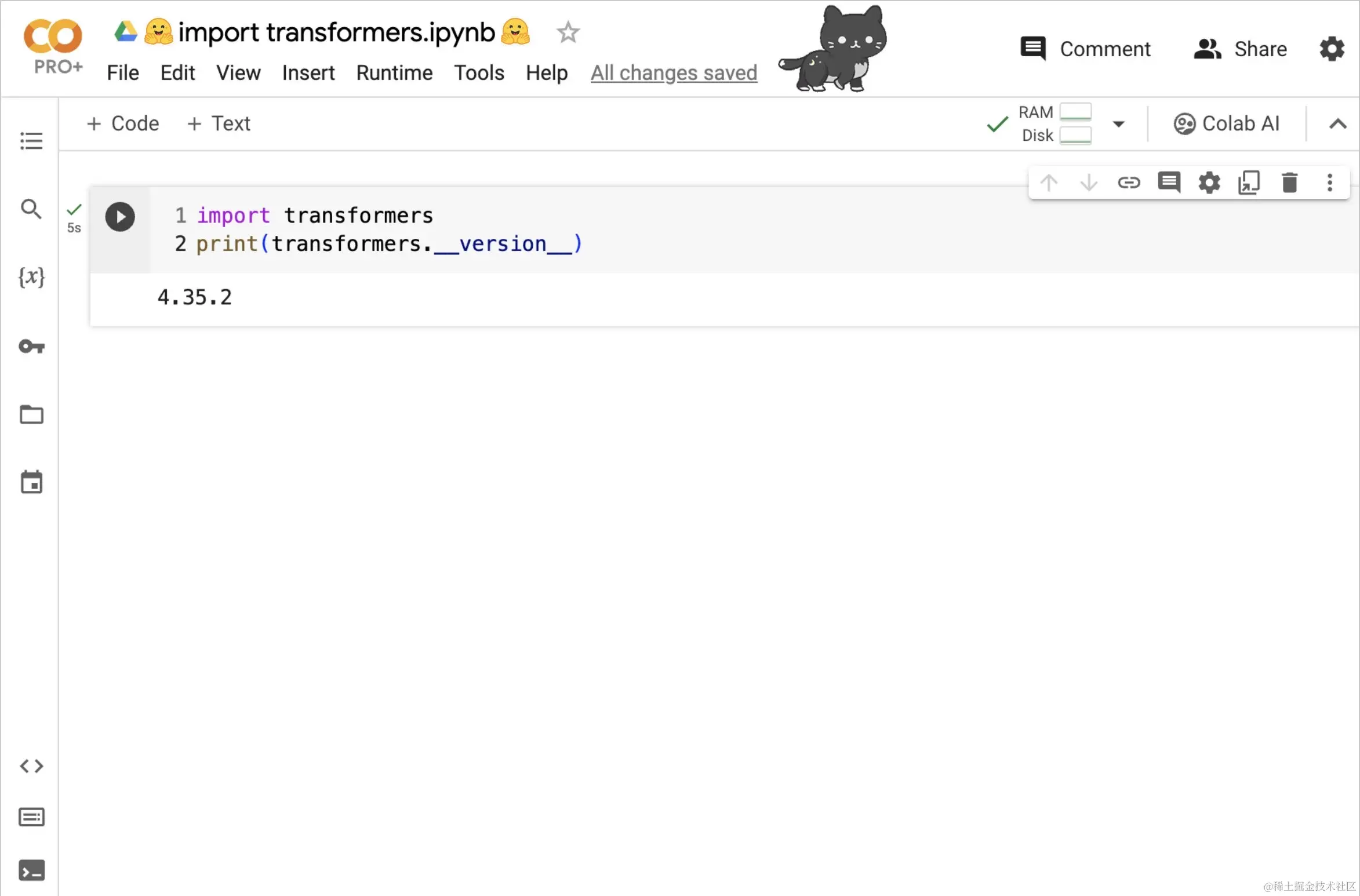 通过与 Colab 团队的共同努力,Colab 托管的运行时镜像现已默认集成了 Hugging Face transformers 库,只需简单执行 `import transformers 即可轻松接入!对于使用 Colab 进行机器学习和深度学习研究的开发者来说,这是一个非常重要的更新。