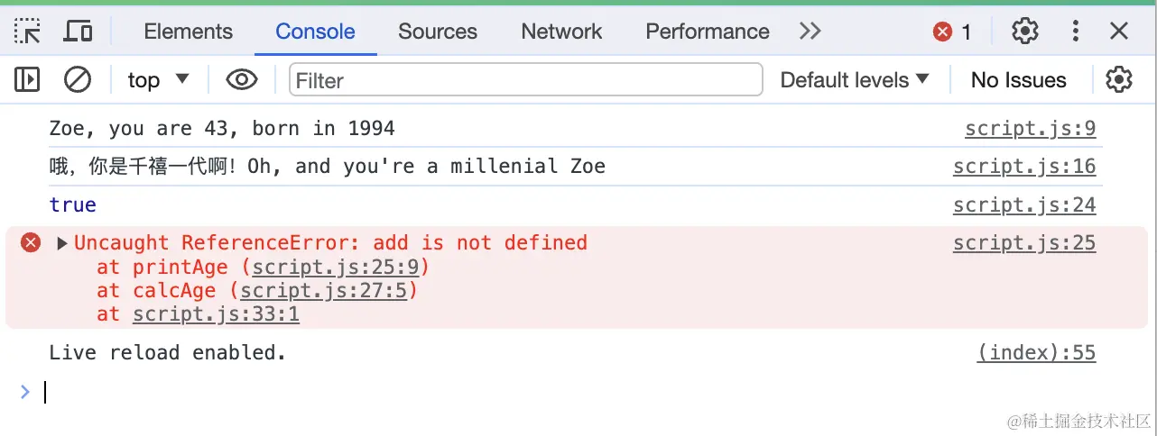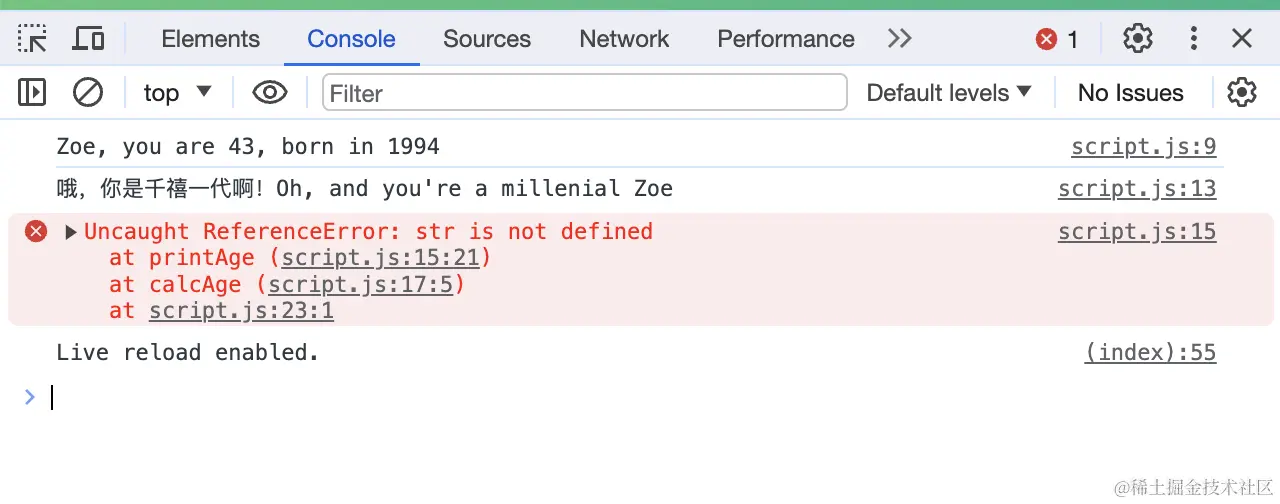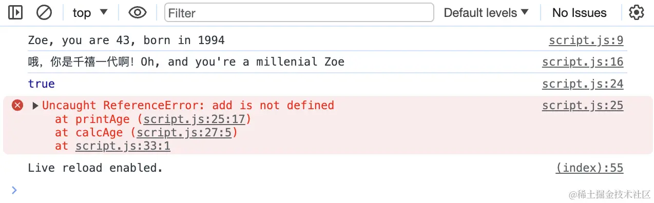 如果此时你调用函数块内部的printAge()函数或age变量,程序会报错,这位这两个变量并非全局变量,而是函数内部的块作用域的变量。