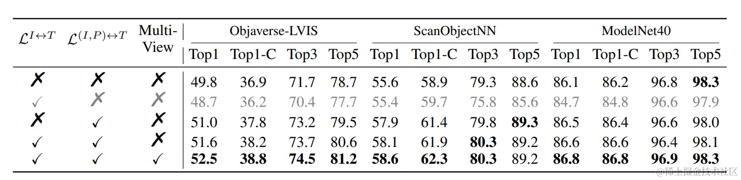 在MixCon3D中,我们引入了一种新的联合表示对齐方法,即图像-3D到文本的联合表示对齐。这个机制通过创建图像和点云的新组合表示来丰富传统的三模态表示,从而提供更准确的真实世界3D对象描述,并增强文本对齐。具体而言,我们在冻结的CLIP编码器上添加了另一个图像到文本的对齐损失,并在其上添加了一个可学习的投影头。通过我们的联合对齐损失,我们发现损失能够进一步提高性能,突显了图像和点云表示融合的关键作用。