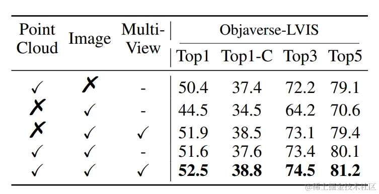 其中是可学习的温度参数,, 是投影头输出的归一化的(image,text)特征。由于3D数据集的规模非常有限,先前的研究利用预训练的CLIP图像和文本嵌入空间来训练具有开放世界识别能力的本地3D模型(包括3D编码器 和投影头)。由于CLIP是在更大规模的数据上进行预训练并且更好地对齐,因此在训练过程中,其图像模型和文本模型 被冻结。具体来说,给定批量的输入图像,文本和点云三元组 (因此被称为图像-文本-3D),3D模型被训练以将点云表示 与CLIP嵌入空间对齐。在这种情况下,优化目标变为: