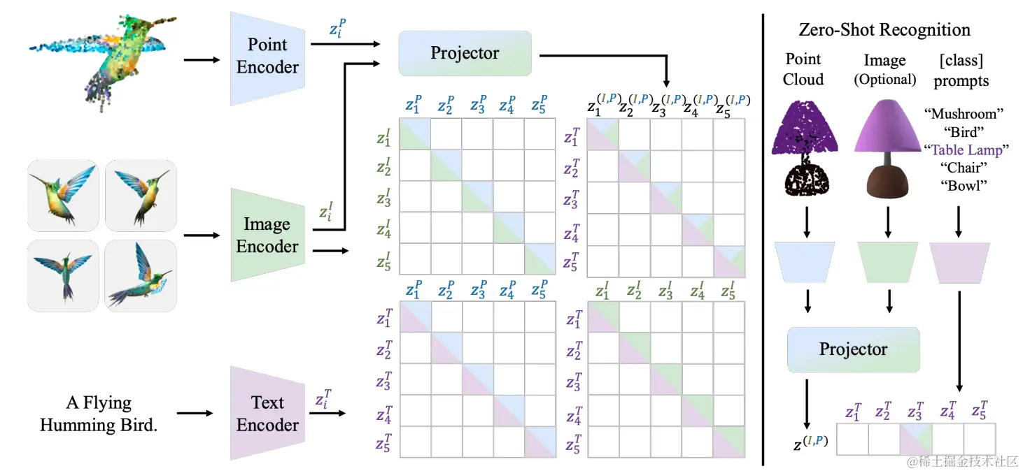 首先回顾了图像-文本-3D对比学习的基本原理。通过利用从网络上爬取的大量图像-文本对,CLIP模型展示了出色的开放世界图像理解能力。通常情况下,给定批量的图像-文本对以及(image, text)编码器(和相应的投影头,CLIP通过对比损失函数进行训练,具体如下: