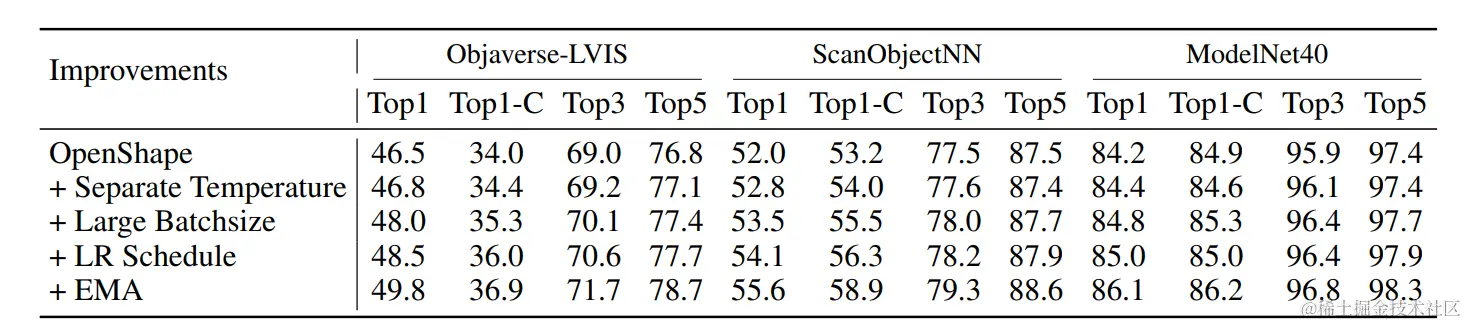 在重新审视训练方法之前,我们需要了解一下ULIP和OpenShape的训练方法。这两种方法都是基于对比学习的图像-文本-3D对齐的范式。ULIP的训练方法采用了共享温度参数和批量大小的方式,而OpenShape则采用了共享批量大小和学习率的方式。这些方法在3D表示学习中取得了显著的性能提升。 然而,我们发现这些训练方法打在一些方面仍有改进的空间。具体来说,我们提出了以下几点改进: