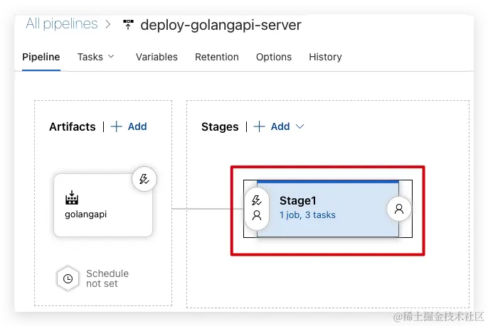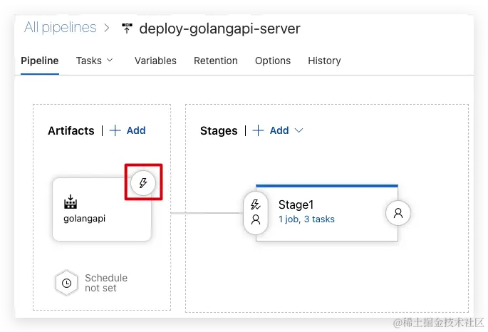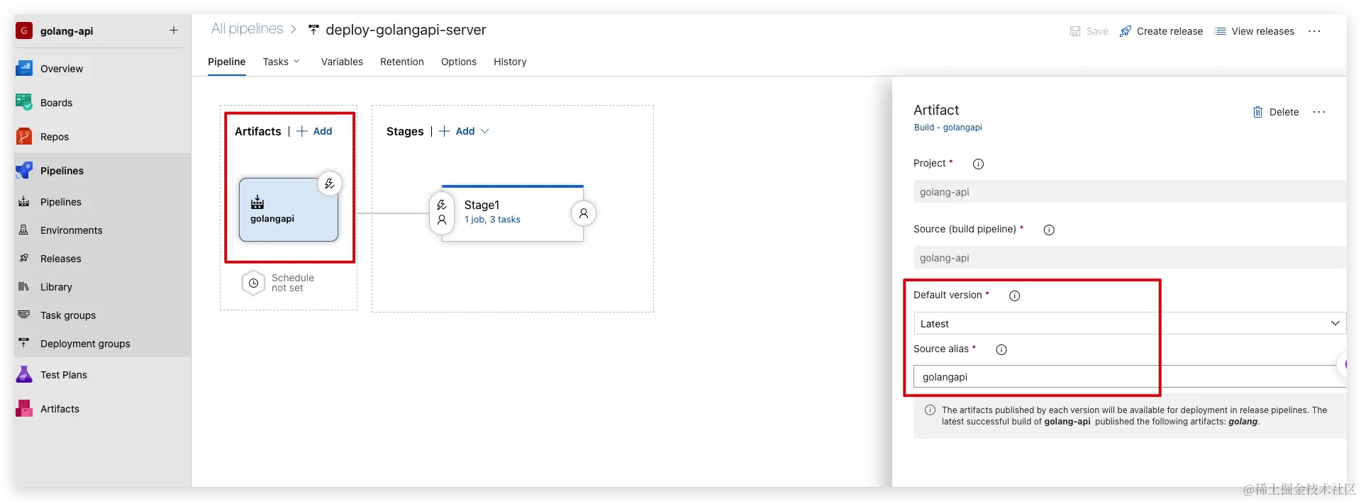 选取Artifact,为pipelines中构建出来的golangapi 二进制文件。
