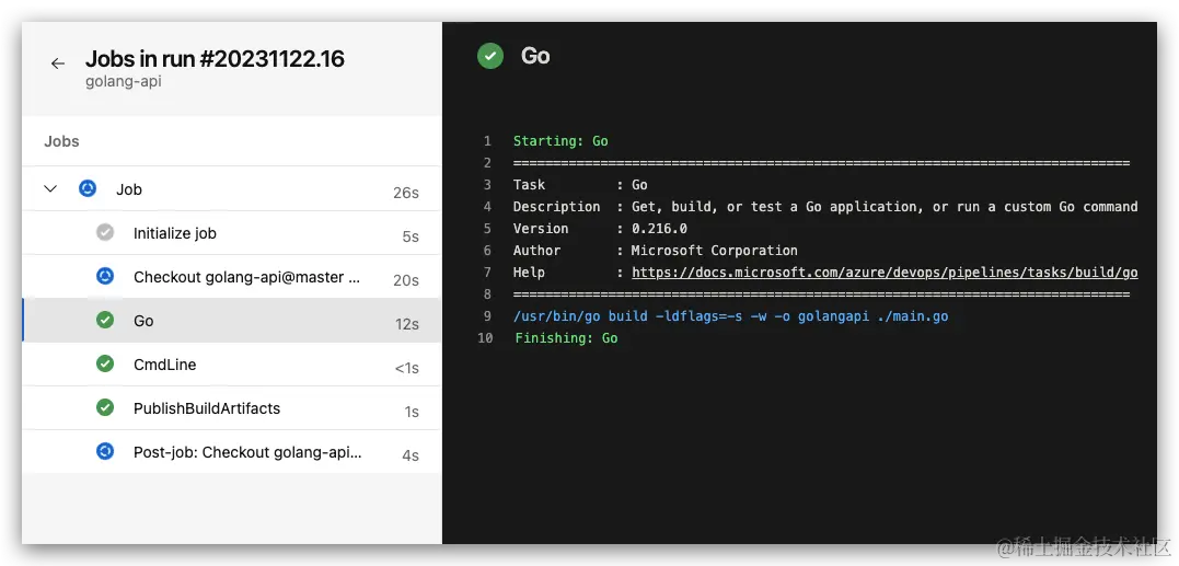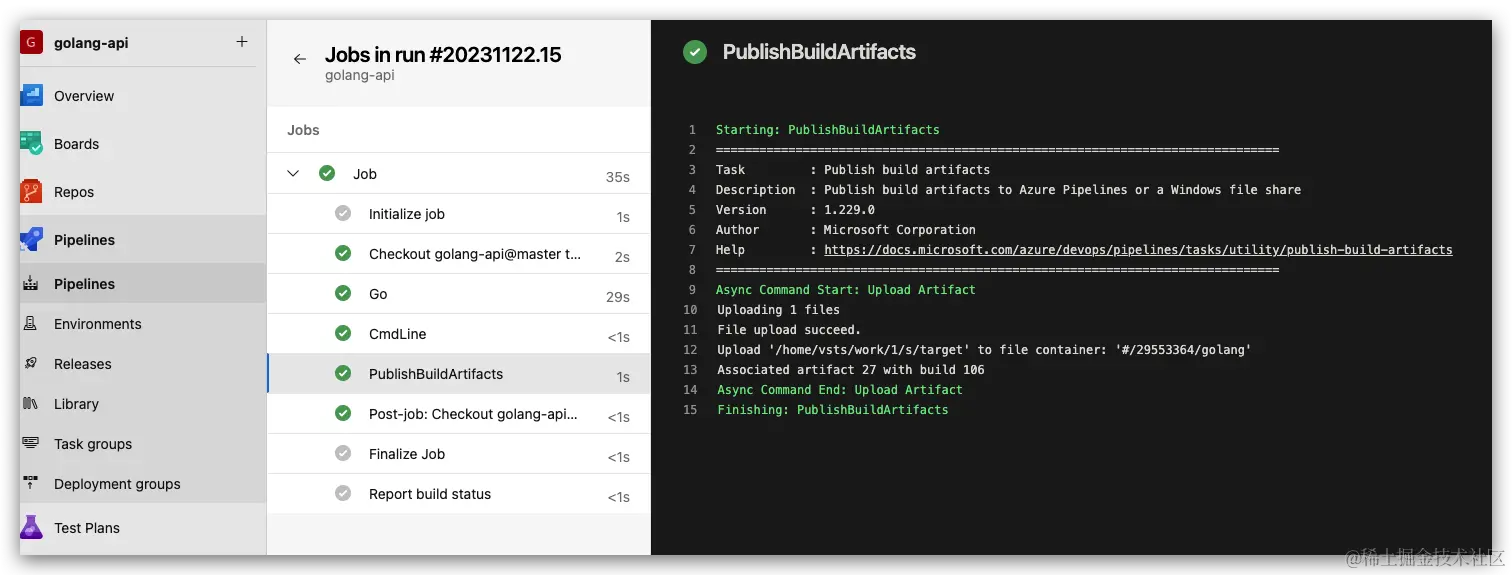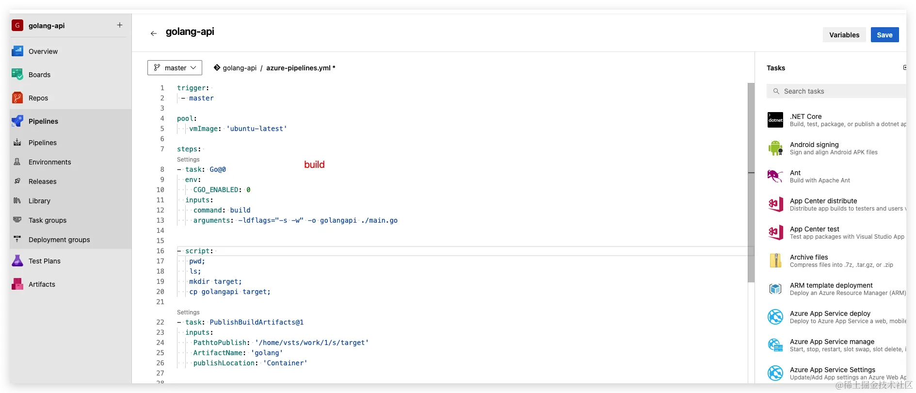 只需要在代码仓库中存在azure-pipelines.yml文件,该文件描述了具体的step过程,在此是利用go build构建golangapi 二进制可执行文件,其次将其发不到Artifacts中。