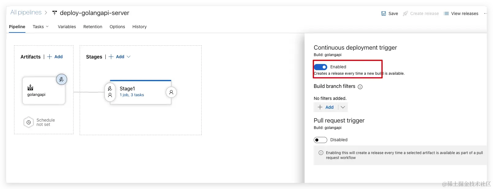 配置Continuous deployment trigger 启用,当pipeline完成后出发release方式。
