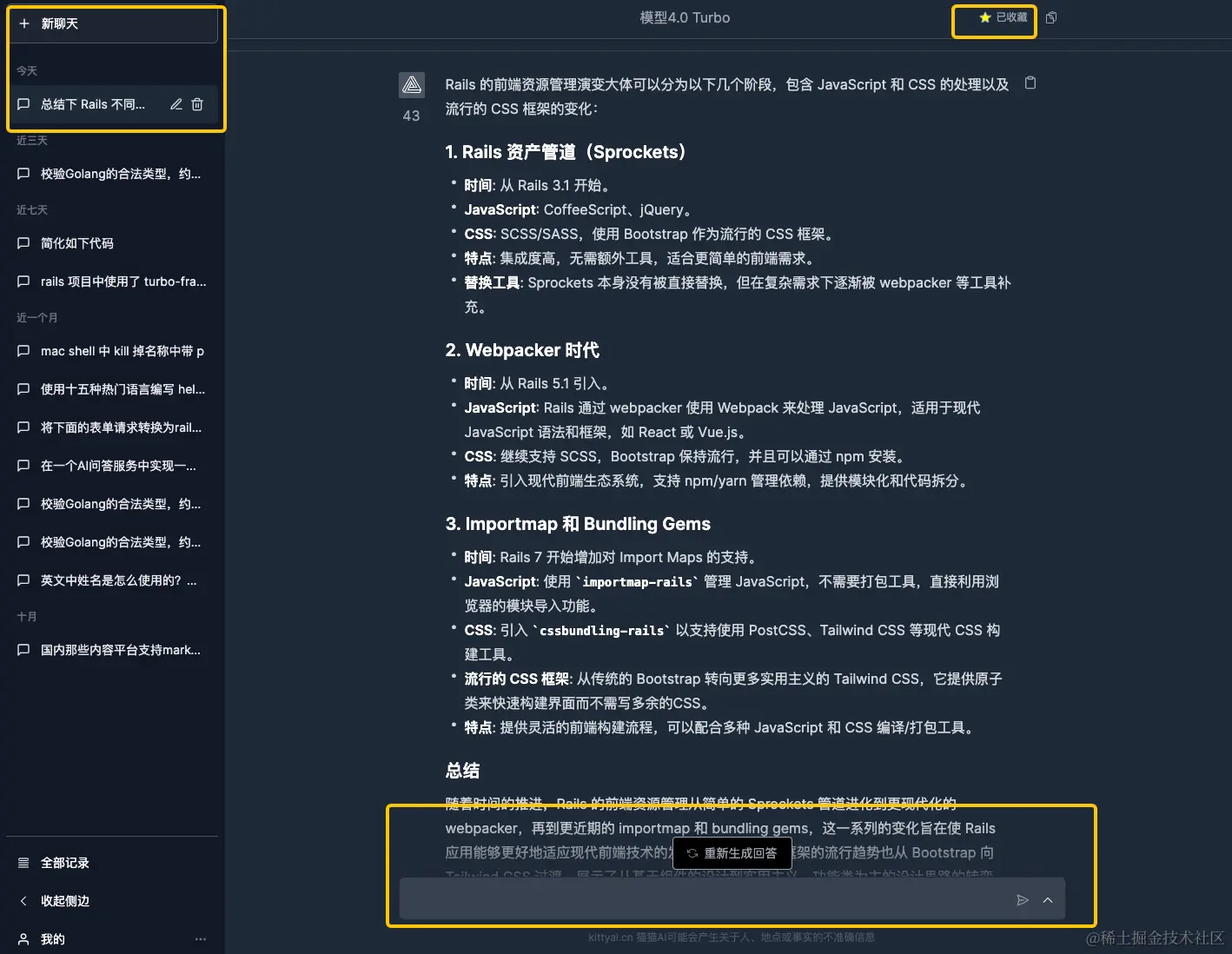 最近用Rails7 + hotwire + importmap 的技术站做了个AI站,下图中标黄的都是有较多异步交互的地方,项目中基本没有使用手动 Ajax 与 JSON 交互,仅使用 turbo_frame、turbo_stream 来完成交互。