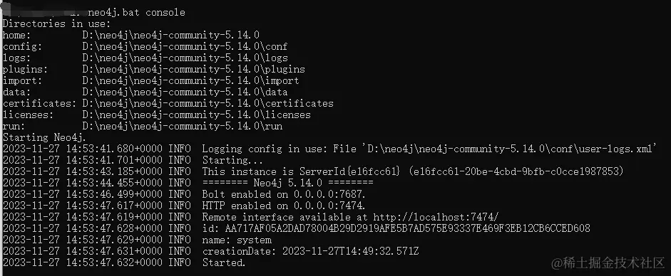 6.启动neo4j,在命令行中输入neo4j.bat console,出现下图说明启动了。如果因为没安装jdk导致没运行成功,可以看下这篇安装JDK的文章: