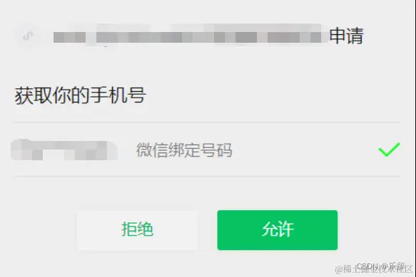 - 如果用户同意授权,前端将获得一个动态令牌code,这个code与wx.login返回的code不同,且获取用户手机号码并不需要预先调用wx.login获取code。